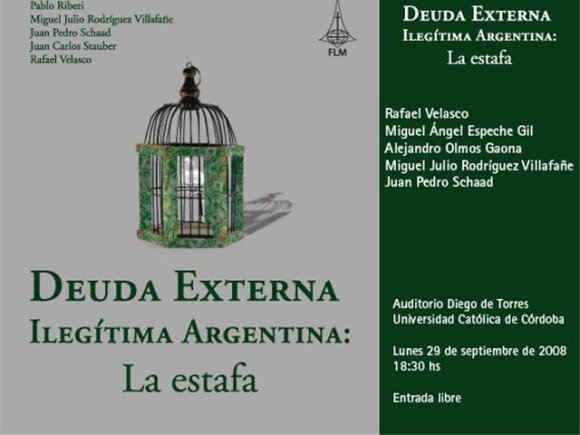El próximo lunes, a las 18.30, en el auditorio Diego de Torres de la Universidad Católica de Córdoba, se presentará el libro“Deuda externa. Ilegítima Argentina: La estafa” escrito por Miguel Rodríguez Villafañe, Miguel Ángel Espeche Gil, Alejandro Olmos Gaona, Rafael Velasco y Juan Pedro Schaad.