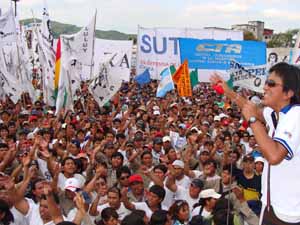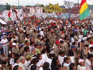 En un entrar incesante, las delegaciones que habían estado durante toda la mañana debatiendo en comisiones fueron ocupando el césped y las gradas, colgando y flameando infinidad de banderas que, por sí solas, eran un espectáculo de colores y demostración de voluntad organizada. Con ritmo incansable, bombos, tambores, redoblantes, sikus, trompetas acompañaban a los cantos que surgían acá y allá en cada lugar del estadio.