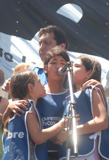 Uno de los niños del Movimiento Nacional Los Chicos del Pueblo leyó: “En poco años más los pibes que nacieron bajo la peor crisis serán adolescentes. El desempleo, el hambre y la violencia signaron sus vidas. Ante esto, los adultos y el Estado tenemos un desafío ineludible, repartir la riqueza a través de las políticas públicas. Es más facil bajar la edad, pero sin embargo ha quedado demostrado que con más cárceles no se resuelve el problema de la seguridad. El señor gobernador, en vez de bajar la ley de imputabilidad, tendría que aplicar una asignación universal para todas las personas menores de 18 años e incrementar estrategias de intervención social tendientes a paliar la desigualdad social en todo el territorio bonaerense. Asimismo, debería propiciar condiciones para que los gobiernos municipales adecuen sus políticas a las leyes13.298 y 13.634 y garanticen un futuro deseable y digno para todos los niños”.