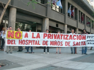 El Hospital de Niños fue entregado por la administración provincial para su gerenciamiento a la Fundación privada española Santa Tecla. "Estamos hoy acá todos los que luchamos por la salud pública para denunciar por parte del Gobierno de la provincia de Salta la privatización del Hospital de Niños El Milagro y de 23 Centros de Salud dependientes a manos de un grupo empresario español", aseveró Silvia León, de la Mesa nacional de CTA y dirigente de Salud de la Asociación de Trabajadores del Estado (ATE-CTA).