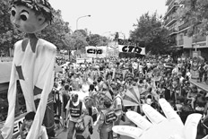 Los títeres gigantes y coloridos, manejados por adolescentes, que se asomaban a los costados de la locomotora eran los únicos que podían dar un indicio de la inmensidad y la potencia de la columna que se extendía detrás de esa primera línea de dirigentes que encabezaban la caravana.